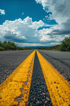 Vibrant Yellow Lines on a Serene Roadway Leading Towards Majestic Mountains Under a Clear Blue Sky