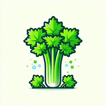Bright green celery ribs with lush leafy crowns pop against a cheerful yellow backdrop, highlighting their crisp freshness and natural appeal.
