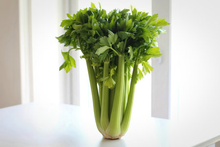 A vibrant bunch of celery with crisp green stalks and leafy tops stands tall on a bright white surface, evoking freshness and healthy eating.