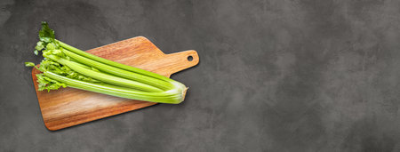 Celery branch bunch on a wooden cutting board. Isolated on concrete banner background