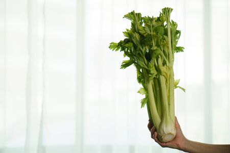 Women hand with fresh celery on white background.