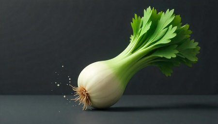 Studio shot of fresh celery bulb on grey background