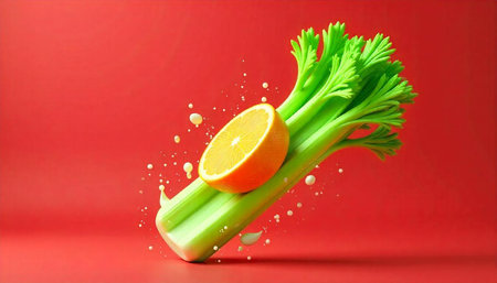 Vibrant celery and orange still life on red backdrop