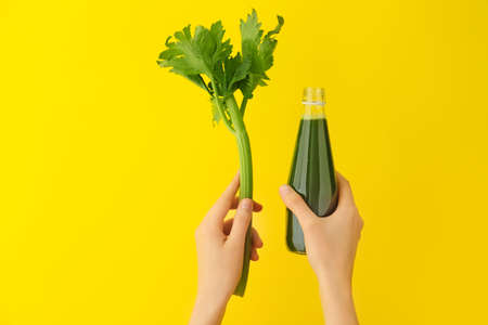 Hands with bottle of celery juice on color background