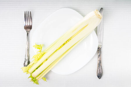 Fresh Chopped Celery Sticks on White Dish. Vegan and Vegetarian Culture. Raw Food. Healthy Diet with Negative Calorie Content