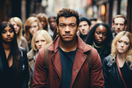 Portrait of an African American man looking into the frame behind whom there are many different people on the street