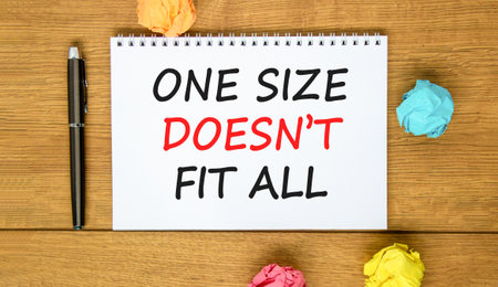 One size does not fit all symbol. Concept words One size does not fit all on beautiful white note. Beautiful wooden background. Black pen. Business one size does not fit all concept. Copy space.