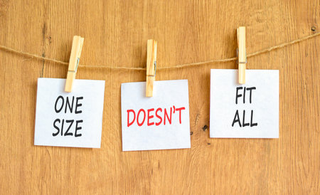 One size does not fit all symbol. Concept words One size does not fit all on beautiful white papers on clothespin. Beautiful wooden background. Business one size does not fit all concept. Copy space.
