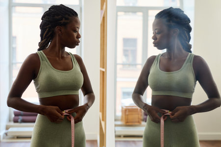 Fit Black woman measuring her waist with tape while standing by window in fitness studio without looking at camera, wearing green activewear