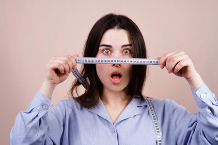 surprised excited young girl with measure tape.