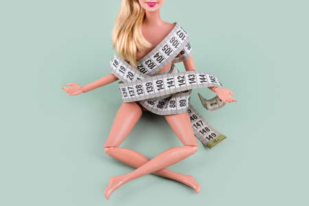 Plastic doll in yoga pose, meditating doll wrapped in measuring tape. Weight loss, diet, overeating control, female fight for perfect fit body, body positive and healthy lifestyle concept