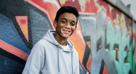 Young asian teen with vitiligo smiling in urban graffiti background
