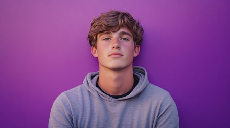 A teenage boy with expressive eyes and acne-prone skin poses confidently in a simple hoodie against a monochrome charcoal grey background, showcasing a natural and authentic look.