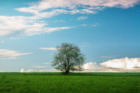 Beautiful summer landscape with big green tree. Amazing cloudy sky.