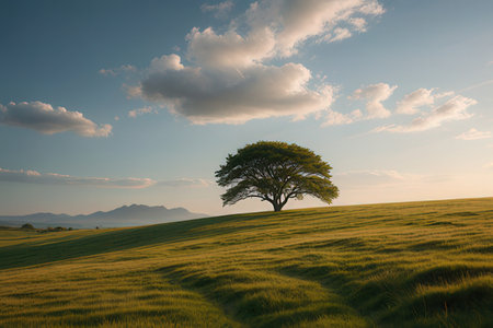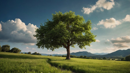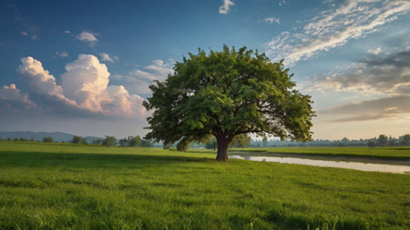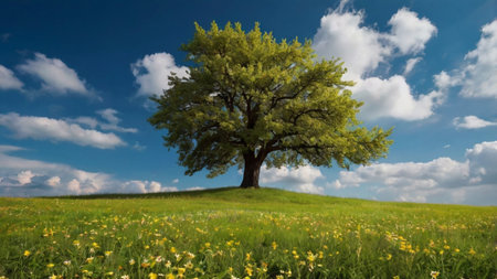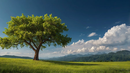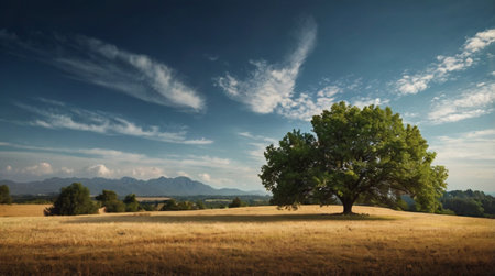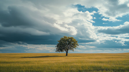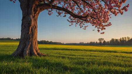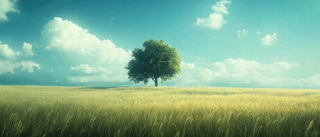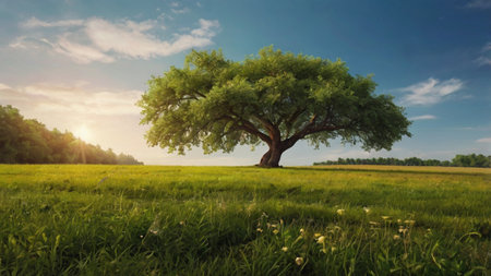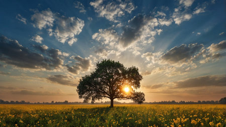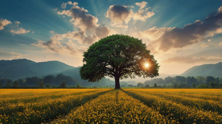 Cinematic landscape featuring a lone tree amidst a vibrant, expansive field