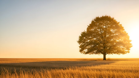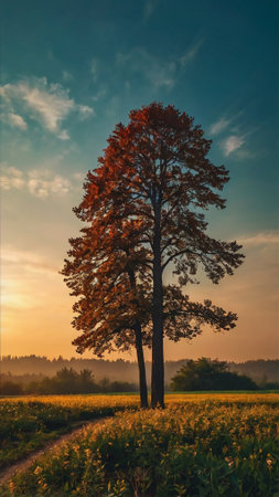A golden tree contrasts a field, its leaves illuminated by a sky blending deep hues and emphasizing seasonal change.