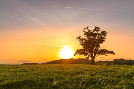 Beautiful summer landscape with a lonely tree in the field at sunset