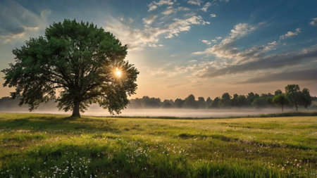 A lone tree stands in a vibrant green field during a breathtaking sunrise. The scene evokes peace and tranquility.