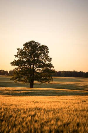 Field of crops, barley, with a large old oak tree during the evening with rich golden color