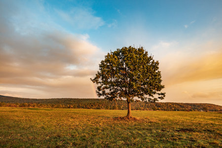Beautiful autumn landscape with lonely tree in the meadow at sunset