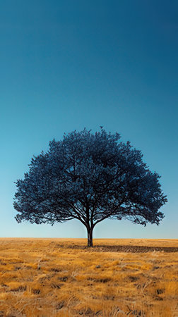 Lone Tree Standing in a Vast Grassy Field Against a Teal and Orange Cinematic Background