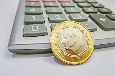 one turkish lira coin on a calculator