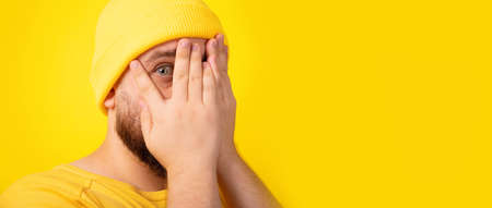Handsome man hides face with hands, looking through palms, feels shy over yellow background, panoramic image