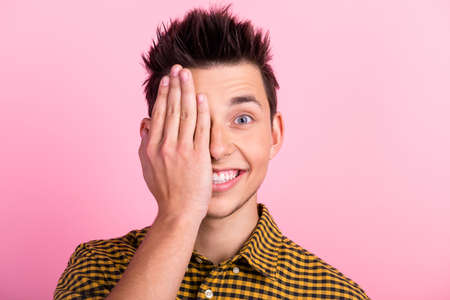 Photo of funny playful young man wear pink t-shirt arms cover eyes