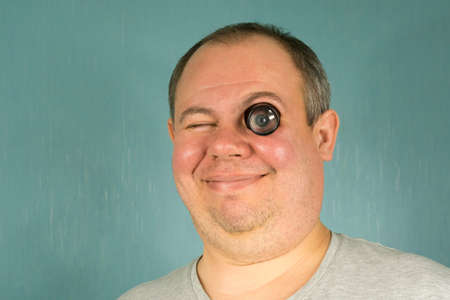smiling man with a watchmaker's magnifier, inserted into the eye, not to hold his hand