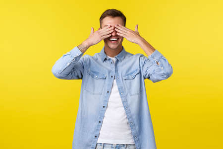 Lifestyle, people emotions and summer leisure concept. Smiling happy handsome man shut eyes with hands and anticipating for surprise, standing upbeat at birthday party, yellow background