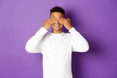 Image of handsome african-american 20s guy, cover eyes with hands and smiling, waiting for surprise with excited face, standing over purple background