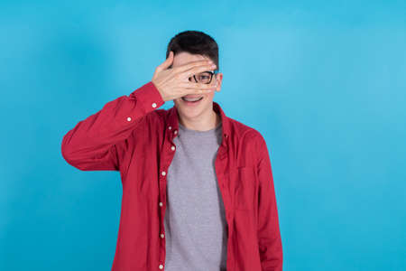 young man or teenage student isolated on color background with his hand on his face looking hidden