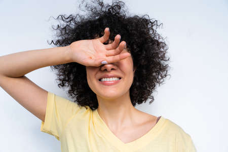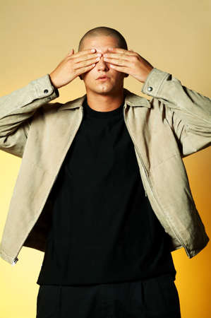 young man with hands covering eyes standing with isolated background. careless and afraid concept