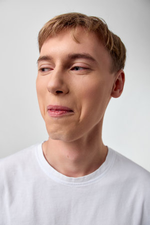 Casual man with a light smile looking away, wearing a white t shirt, clean background, soft lighting, relaxed mood, natural expression, suitable for lifestyle and fashion photos