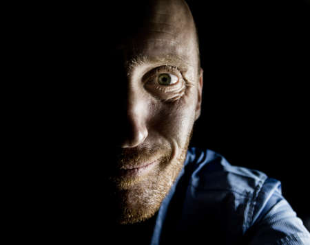 Portrait of adult caucasian man who smiles like maniac and seems madness. Low-key lighting. isolated on black.