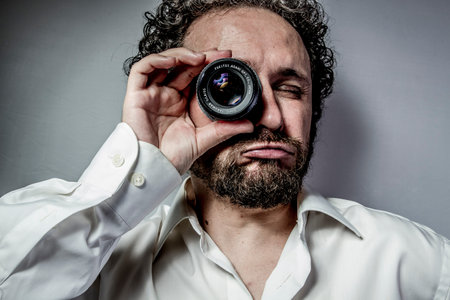 photographer with lens, man with intense expression, white shirt