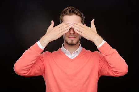 Young bearded man in orange sweater closing eyes with hands while playing hide-and-seek or being scared