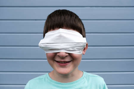 A funny view of a smiling boy wearing white protective surgical medical mask on his eyes instead of a mouth, he prank epidemia and pandemia of covid, rofl