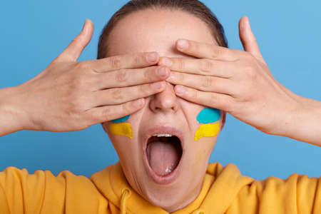 Portrait of Ukrainian woman covering her eyes with palms, screaming loud, keeps mouth widely opened, being scary, feels fear because of war, expressing shock.