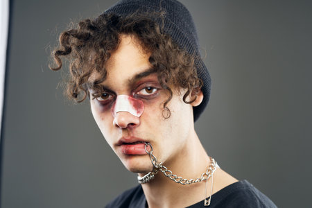 male boxer with bruises under his eyes training blood aggression
