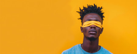 Portrait of a young African man with a blindfold, standing against a pastel yellow background with copy space.ai generated