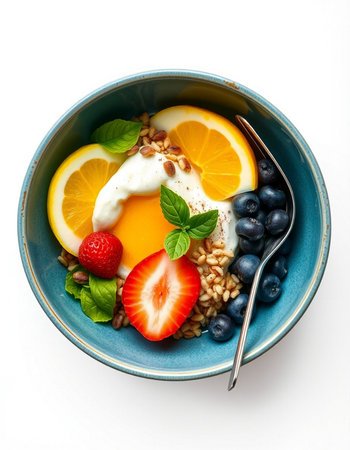 yogurt with blueberries, orange and mint on a white background