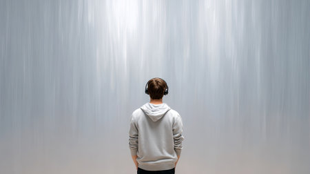A person wearing headphones stands in front of soft, blurred background, creating serene and contemplative atmosphere. light appears to cascade down, enhancing feeling of tranquility and focus