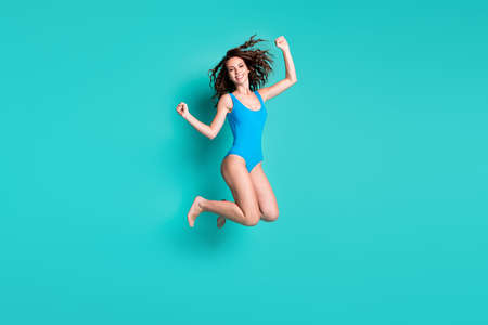Photo of lovely sweet slim lady model jump high raised fists toothy smile celebrate success trampoline advert season discount sales wear blue swimsuit isolated turquoise color background