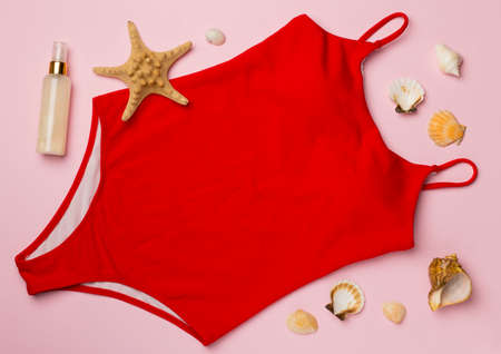 Beautiful red bikini and accessories on color background, top view.