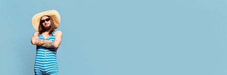 Portrait of young man in striped swimming suit, sunglasses and straw hat posing against blue studio background