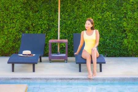 Portrait beautiful young asian woman leisure relax smile around outdoor swimming pool for vacation