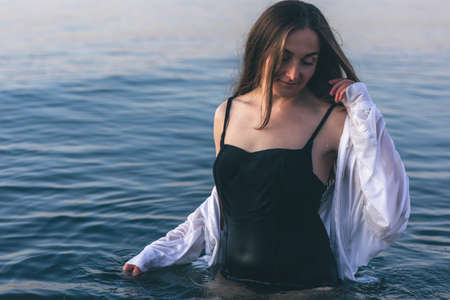 Young beautiful woman standing in the water. Black swimsuit. Vintage style. Black and white