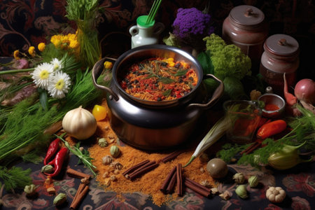 vibrant spices and herbs surrounding jambalaya pot, created with generative ai