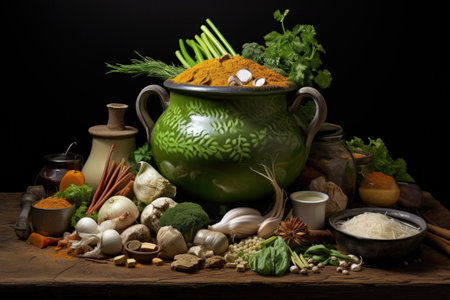 soup ingredients arranged artistically around an empty pot, created with generative ai
